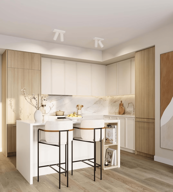 Made up of two six-story buildings, Chapter pays homage to the industrial past with an exterior inspired by historical images of Fraser Mills. Charcoal brick and grey grooved metal mix with modern details like the slatted wood entryway, giving the architecture a welcoming sense of warmth.